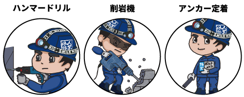 ハンマードリル・削岩機・コアを使用しての穴あけやカプセルやカートリッジなどを使用してのアンカー定着などいろいろな種類の施工をこなしてきました。
