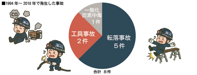 内訳を見ると、転落事故が5件、工具による事故が2件、一酸化炭素中毒が1件でした。